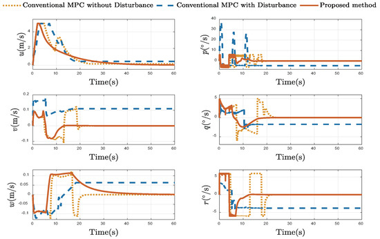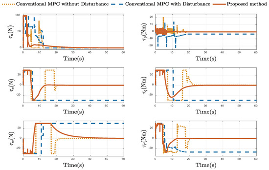 Figure 10 displays the time evolution of the UUV’s linear and angular velocities. The results highlight the robustness of the proposed method. The conventional MPC under disturbance generates oscillatory control actions, particularly visible in the chattering-like behavior of the angular rates, and its linear velocities fail to settle at zero. The proposed method produces smooth velocity profiles that converge to zero, closely mimicking the ideal baseline. This demonstrates the controller’s ability to maintain stability and execute the maneuver efficiently despite external disturbances.
