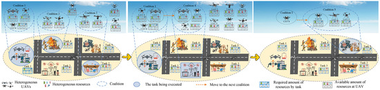 With continuing advances in avionics and wireless networking, unmanned aerial vehicle (UAV) swarms can undertake cross-scale tasks including reconnaissance, search and rescue, communication assurance, and emergency power supply [1], even when terrain is constrained and infrastructure is damaged [2]. Nevertheless, swarm-level collaboration essentially depends on the organizational mechanisms of task allocation and resource configuration [3]. Under constraints on endurance, payload, and sensing capacity, single-UAV assignment paradigms struggle to satisfy the joint resource and temporal requirements of complex tasks [4]. To enhance system-level feasibility and overall benefit, forming coalitions that aggregate capabilities across platforms [5,6] becomes a necessary pathway for achieving this goal.