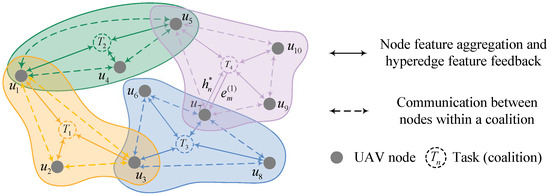 To accommodate structural evolution during planning, we construct a time-varying heterogeneous hypergraph at each decision step t. The node set denotes UAVs. The hyperedge set denotes the tasks within the planning scope at step t. A task appears as a hyperedge with member set . A node in multiple hyperedge models represents overlapping coalition membership. This structure specifies connectivity, propagation paths, and normalization domains of structural information during policy learning, as illustrated in Figure 3.