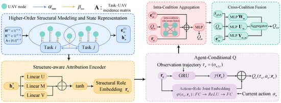 - Agent-Conditional Value Function. An individual policy must adapt to structural roles and local observations. We define an agent-conditional Q function. Here, the role vector modulates both the temporal encoder and the action embedding:where is the local history, is the current action, generates GRU parameters conditioned on the role, encodes actions jointly with roles, and ⊕ denotes concatenation.