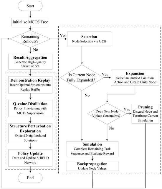 To overcome the combinatorial explosion of overlapping coalition structures and the tendency of local search to get trapped in suboptimal regions, we augment the structure-aware hierarchical value decomposition in the previous section with MCTS for global structure optimization, and feed the discovered high-quality structural evidence back to policy learning, thereby forming a closed loop of structure prior, feasible-set pruning, global evaluation, and policy feedback. The key idea is to use the masked encoding of a time-varying hypergraph as a bridge so that partially assigned structures receive stable and comparable value estimates within the bidirectional hypergraph attention and hierarchical value decomposition networks; structure priors then guide the tree policy, incremental constraint checks maintain real-time feasibility, and Pareto-nondominated solutions are transformed into demonstrations and distillation signals to jointly accelerate policy convergence and improve global quality. The workflow is shown in Figure 5.