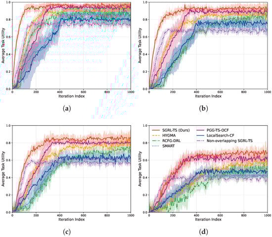 This performance stems from a careful consideration of the benefit–cost balance. SGRL-TS estimates timing and energy constraints online and maps them onto a unified utility scale, which steers the search toward ranges where adding UAVs yields net gains while suppressing ineffective parallelism and communication congestion as scale grows, thus avoiding high-scale regression. Temperature-controlled sampling and reuse of candidate structures broaden exploration, and as early and later convergence occurs, they converge to low-conflict configurations. Combined with penalties and pruning for repeated assignment and resource contention, these mechanisms reduce structural oscillation and tail-phase jitter. The result is a better compromise between task completion and coordination cost, leading to higher and more stable final utility.