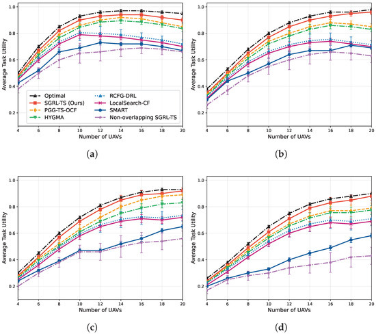 Average task utility versus the number of UAVs under different task loads: (a) ; (b) ; (c) ; (d) .
