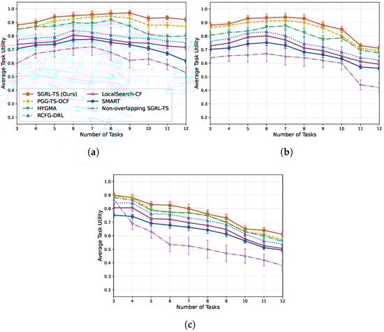 Average task utility versus the number of tasks under different swarm sizes: (a) UAVs; (b) UAVs; (c) UAVs.