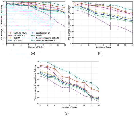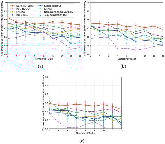 Figure 10a–c report the coalition-level temporal coordination performance of all methods. The evaluation metric is the coalition synchronization sufficiency, defined as the normalized score obtained from the coalition arrival-time deviation cost according to (23); larger values indicate more synchronized coalition arrivals under the given reference time scale. As the number of tasks increases, the synchronization sufficiency of all methods decreases overall, indicating that higher task congestion makes it harder for coalitions to achieve good temporal coordination; moreover, when the number of UAVs is reduced from 15 to 5, the overall degradation in synchronization performance becomes more pronounced. The advantage of SGRL-TS in synchronization sufficiency is most pronounced in configurations with more tasks and tighter resources, suggesting that structure-guided overlapping coalition formation combined with joint value decomposition can effectively suppress the dispersion in coalition arrival times. In contrast, non-overlapping SGRL-TS and Task-completion OCF, which only focus on task completion rate, exhibit significantly lower synchronization sufficiency under high-load scenarios, indicating that ignoring overlapping structures or lacking explicit synchronization modeling leads to markedly degraded temporal coordination among coalitions.