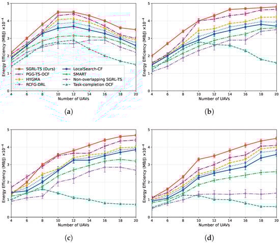 Energy efficiency versus the number of UAVs under different task loads: (a) ; (b) ; (c) ; (d) .