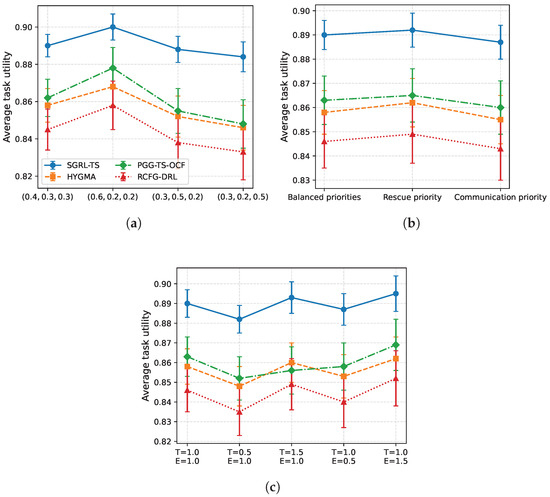 Across all configurations of the three sensitivity tests, SGRL-TS consistently attains the highest average task utility, with a performance gap of approximately 2–3 percentage points relative to the best-performing baseline PGG-TS-OCF, and exhibits substantially more minor variance, indicating overall robustness to perturbations in weights, priority settings, and normalization scales. Specifically, in Figure 12a, the completion-emphasized weight vector increases the utilities of all four methods, whereas the synchronization- and energy-emphasized weight vectors and reduce the overall utilities, with a particularly pronounced impact on RDFG-DRL, while the curve of SGRL-TS exhibits only mild fluctuations; Figure 12b shows that different task-priority topologies induce only slight changes in the utilities of all methods, and SGRL-TS can still better coordinate resources and synchronization constraints in the rescue-priority scenario, maintaining a stable performance lead; in Figure 12c, scaling or mainly changes the absolute level of utility, and more stringent normalization (such as or ) has a more pronounced negative impact on RCFG-TS, whereas both the performance and variance of SGRL-TS vary only moderately.