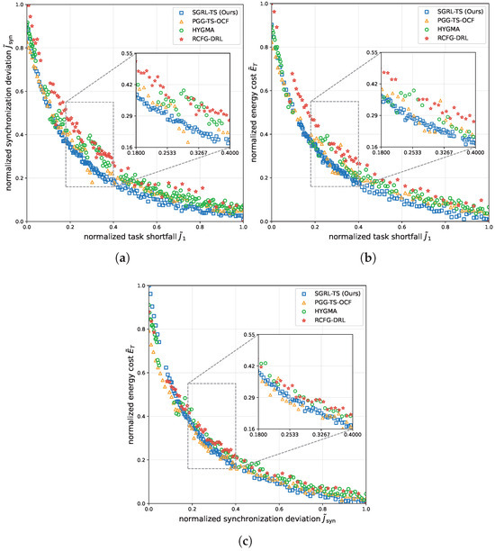 Multi-objective trade-off among normalized task shortfall, synchronization deviation, and energy cost: (a) normalized task shortfall versus normalized synchronization deviation ; (b) normalized task shortfall versus normalized energy cost ; (c) normalized synchronization deviation versus normalized energy cost . All three objectives are min–max normalized over the collected solutions so that lower values are better.