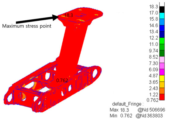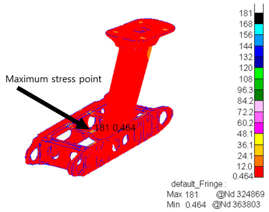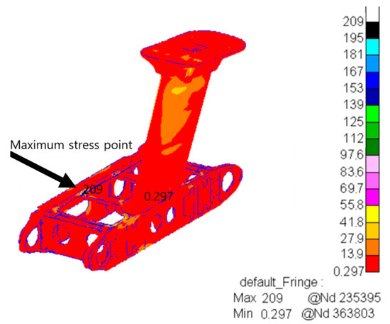 From the analysis of Figure 10, the maximum lateral impact stress is 209 MPa, which occurs at the bolted junction of the horizontal box. This indicates that the horizontal box bolted joints also face higher loads under lateral impact loads and are important concerns for the structure in the lateral direction. In practical applications, it is necessary to further optimize the connection method and structural strength of the part to improve the fatigue damage resistance of the structure under lateral impact.