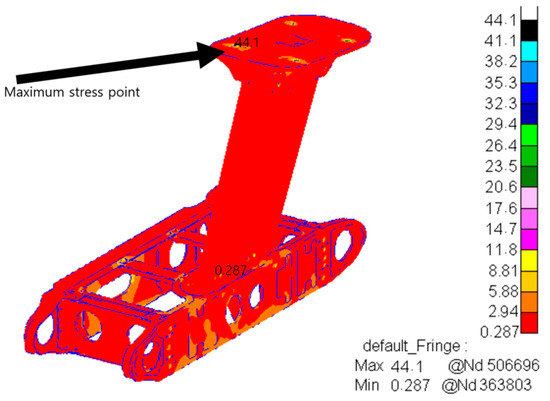 Through the analysis of the transient response of the structure in heading, vertical, and lateral directions, the maximum values of impact stress in each direction and their locations were identified. The maximum heading impact stress occurs at the bolted junction of the horizontal box, the maximum vertical impact stress occurs at the bolted junction of the vertical transition beam and the horizontal box, and the maximum lateral impact stress occurs at the bolted junction of the horizontal box, and they are the weak points of the vibration fatigue of the structure.