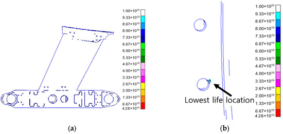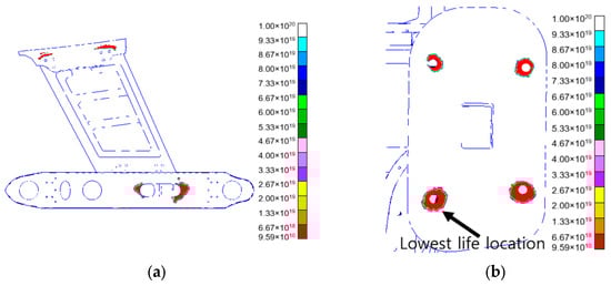The distribution of life under vertical vibration is shown in Figure 12. Figure 12a shows the life distribution characteristics of the structure under vertical vibration, and Figure 12b indicates the location with the lowest life.