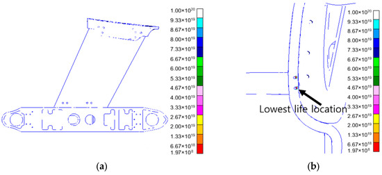 The life distribution under heading impact is calculated by MSC. Fatigue software, as shown in Figure 14. Figure 14a shows the life distribution characteristics of the structure under heading impact, enabling a visual view of the difference in length of life in different areas; Figure 14b identifies the location of the lowest life.