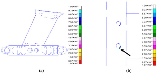 Analysis showed that the minimum lateral impact life is 1.07 × 108 times, which occurs at the bolted junction of the horizontal box segment. This further highlights the fatigue susceptibility of bolted joints in the horizontal box under lateral impact loads. In practical applications, it is necessary to improve the connection method and structure of the part to improve its ability to resist lateral impact fatigue.