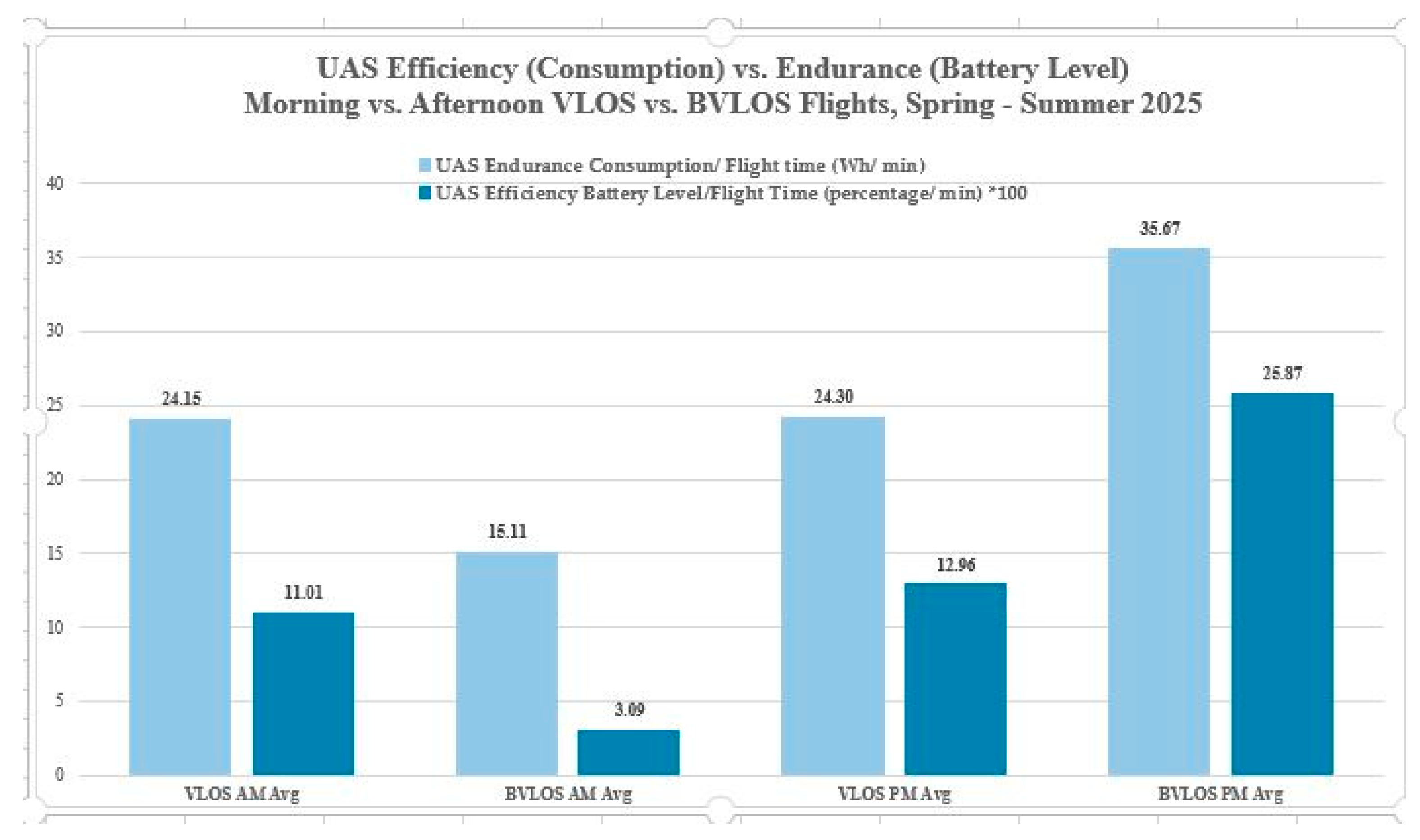 The analysis undertaken in this initial study was limited, given the small sample sizes for the VLOS and BVLOS flights and the unbalanced samples. Table 3 shows the H1 UAS endurance, efficiency, and waypoint deviation results for VLOS and BVLOS flights. UAS endurance was measured in terms of distance flown, speed, and UAS battery consumption, normalized for flight time. UAS efficiency was measured in terms of UAS battery levels and UAS waypoint deviation was measured as the standard deviation of UAS direction, reflecting wind conditions at the time. All H1 data were provided directly from the UAS.