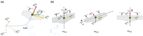 where , , and denote the Euler angles corresponding to roll, pitch, and yaw, respectively. Specifically, is the angle between the UAV’s symmetry plane and the vertical plane containing the body axis , and it is defined as positive when the UAV rolls to the right. is the angle between the body axis and the horizontal plane –, defined as positive when the UAV pitches nose-up. is the angle between the projection of the body axis onto the horizontal plane – and the inertial axis , defined as positive when the UAV yaws to the right.