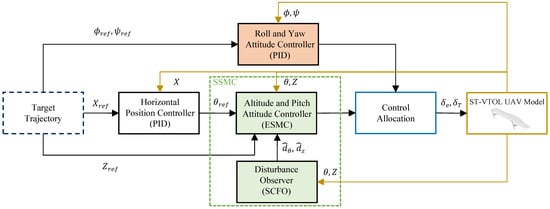 To achieve precise hovering under external wind disturbances, we use the new anti-disturbance control method—SSMC. Figure 3 shows its overall control structure. The position and attitude controllers are designed using a cascaded state feedback strategy. Specifically, the lateral control goal is to keep the roll and yaw angles of the ST-VTOL UAV at zero degrees, which a traditional PID controller achieves. For simplicity of notation, in the remainder of this section, X and Z refer to the corresponding variables and . The longitudinal control objective is to stabilize the ST-VTOL UAV at the reference position . First, the horizontal position controller uses a PID method to generate the desired pitch angle . Simultaneously, the desired altitude is also input into the ESMC and the desired pitch angle. Then, the ESMC tracks and concurrently. Finally, the outputs of the lateral and longitudinal controllers are mapped through the control allocation module. This module is responsible for calculating the actual torque and thrust commands applied to the drone. During this process, the ST-VTOL UAV model continuously updates the system states. These system states are fed back to each sub-controller to ensure closed-loop stability and robustness.