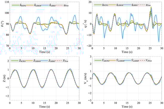 Comparison of the pitch angle and angular velocity, altitude and vertical velocity tracking performance achieved by SCFO, LESOF, and LESO. The tracking performances of Z and are very similar, so the green and orange curves are not clearly visible, although they are indeed present.