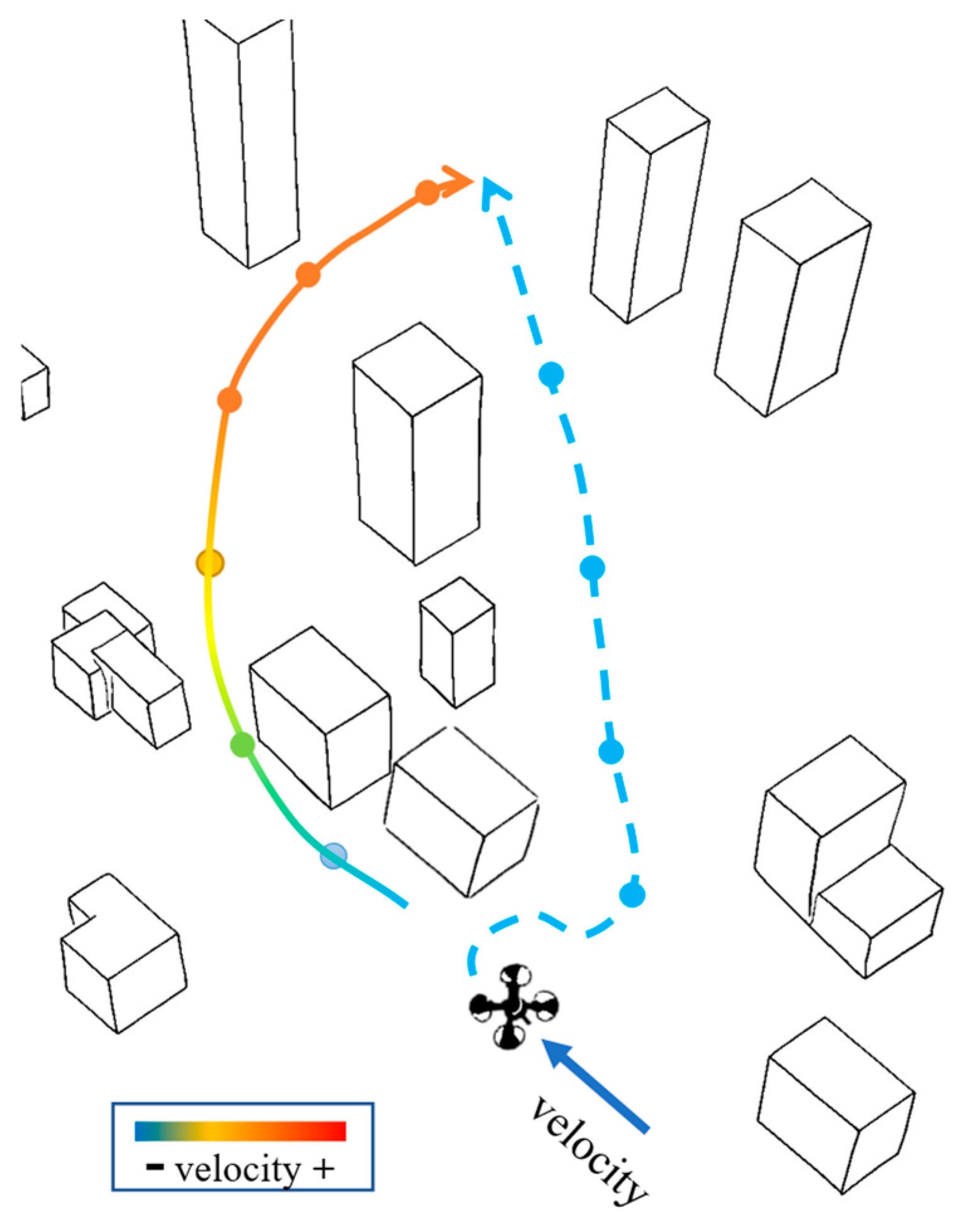 Figure 4, when the velocity direction of the aerial drone is toward the obstacle, the gradient direction given by the ESDF is opposite to the velocity direction, which aggravates the maneuvering danger. Conversely, obstacle information can be disregarded when the gradient direction aligns with the velocity direction. The expansion step