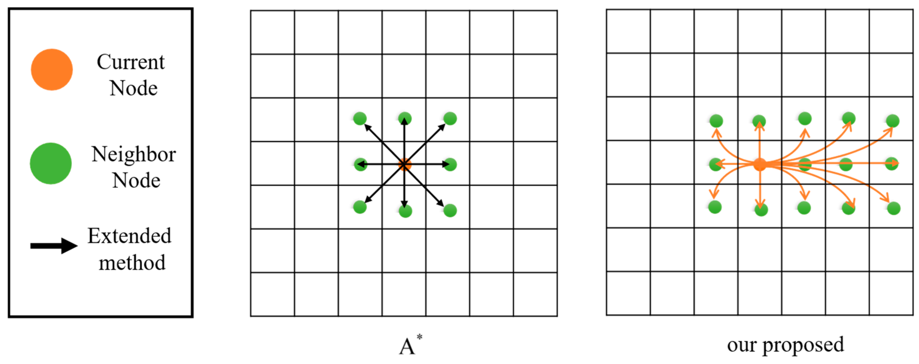 Unlike traditional search-based path planning algorithms such as A*, which typically consider a fixed number of spatially adjacent nodes (e.g., 8 in 2D or 26 in 3D), the proposed algorithm incorporates a dynamically adjustable point expansion step size mechanism, as shown in