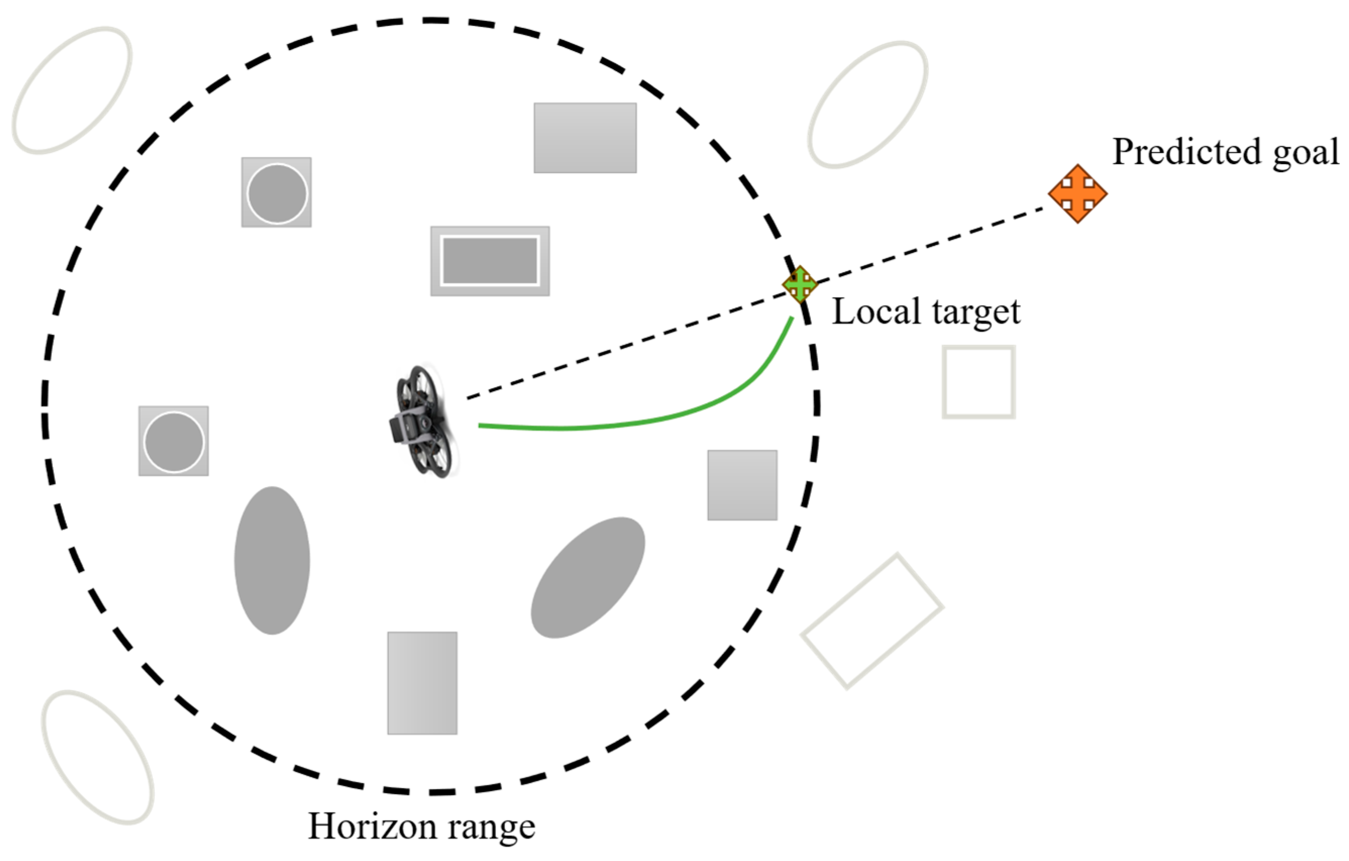 Figure 6. The process begins by establishing a global target using the prediction data from Algorithm 1. If this global target lies outside the horizon space (denoted by the dotted circle), a line is projected from the UAV’s current position to the global target. The local target is then defined as the point where this line intersects the horizon space boundary. Since planning outside this space is inefficient, all path search and trajectory optimization are confined within it.