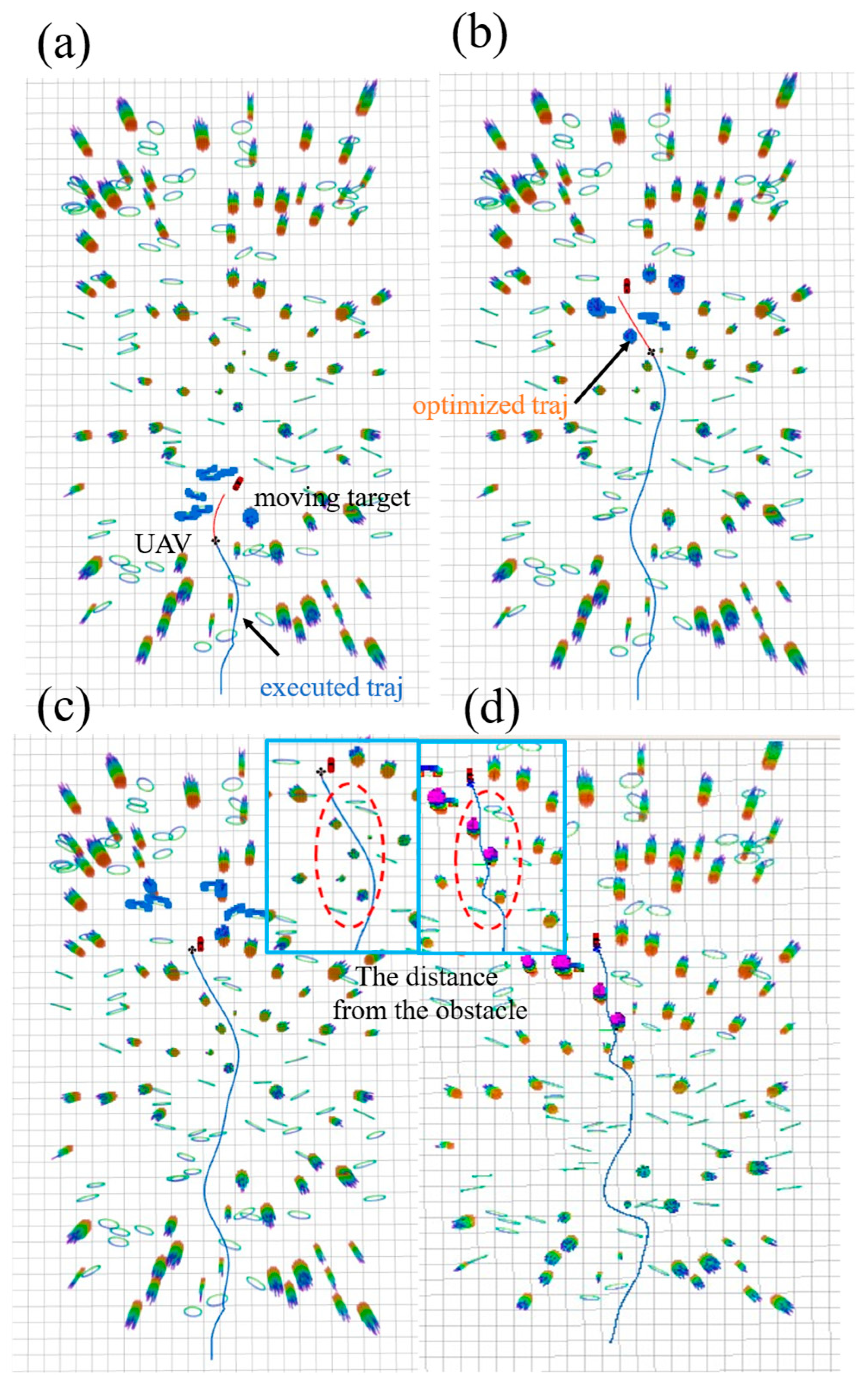 Figure 7. (1) Safety Check after Optimization: Our planning framework consists of a front-end path search that uses a discrete obstacle inflation for geometric feasibility, followed by a back-end trajectory optimization that employs soft constraints for smoothness and more precise obstacle avoidance. After the optimized trajectory is generated, a final safety validation is performed by discretizing the trajectory and rigorously checking for collisions against the ESDF. A re-planning cycle is immediately triggered if any discretized point on the optimized trajectory penetrates an obstacle (i.e., the signed distance ≤ 0). This ensures that the final output is strictly safe, even if the soft-constrained optimizer occasionally produces a trajectory that slightly cuts corners due to cost balancing. (2) Periodic Re-planning: The motion planning module is also invoked periodically at fixed time intervals of T = 0.5 s. This ensures system reactivity to new obstacles and dynamic changes that may not have been present during the previous planning cycle.