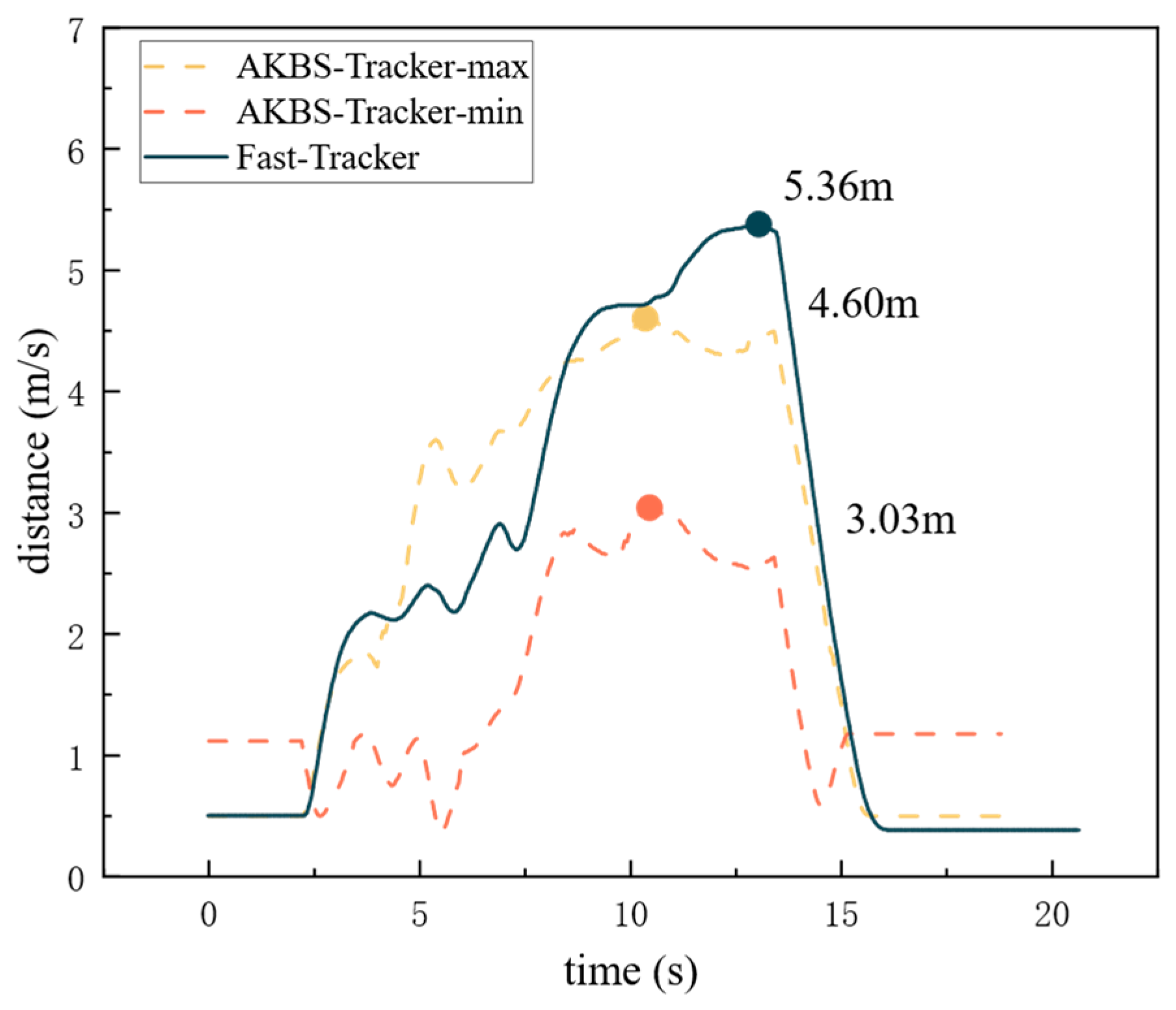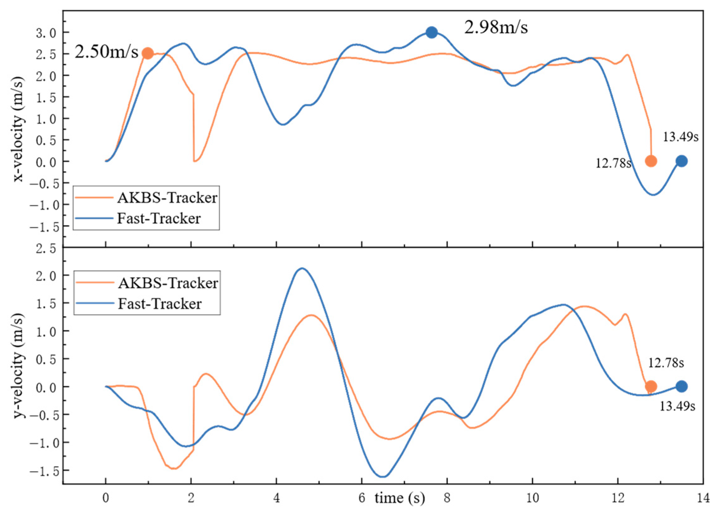 The AKBS-Tracker decreased flight time effectively while maintaining the planned speed within the defined maximum speed limit, demonstrating its advantage in sustaining dynamic feasibility.
