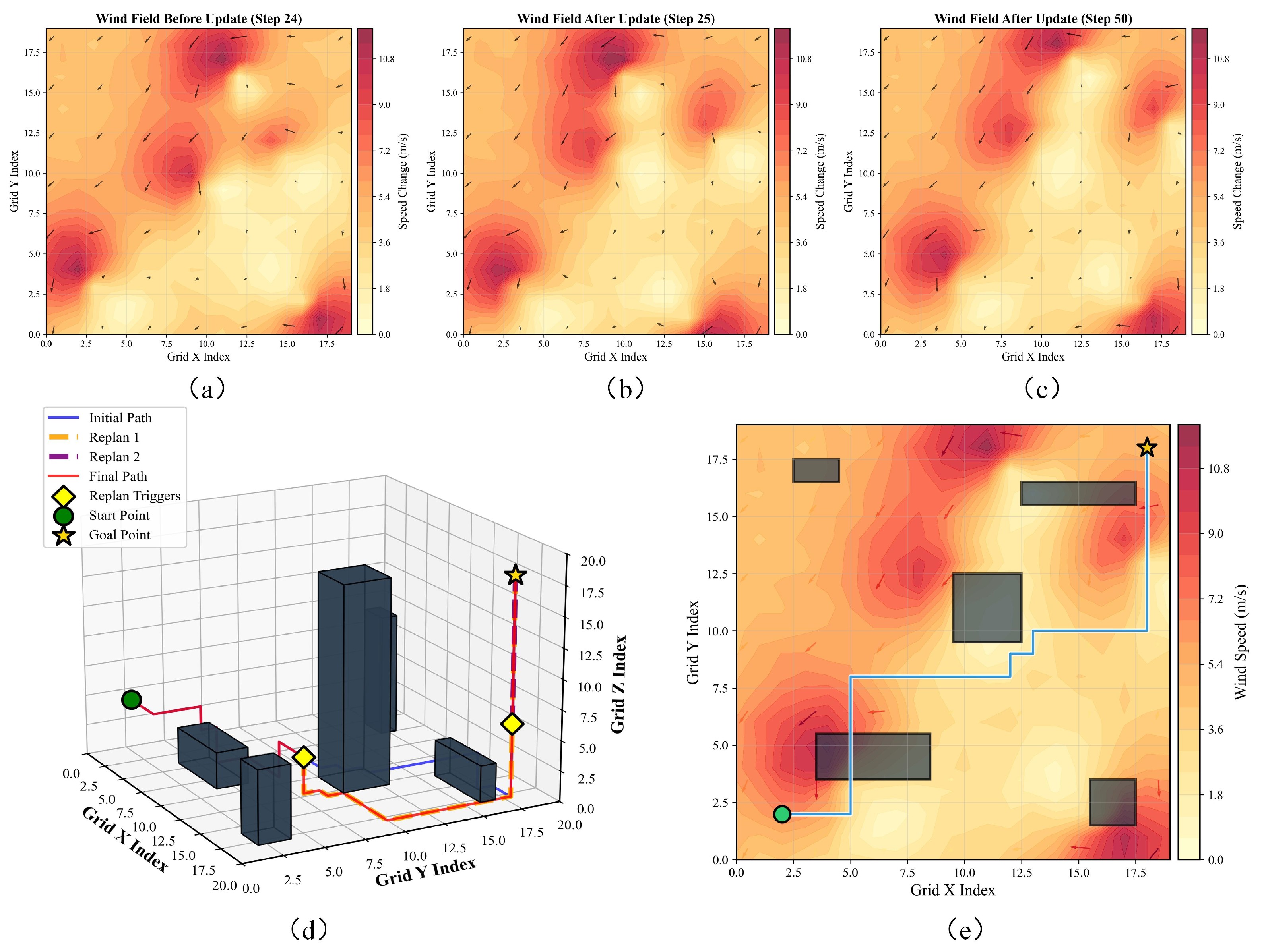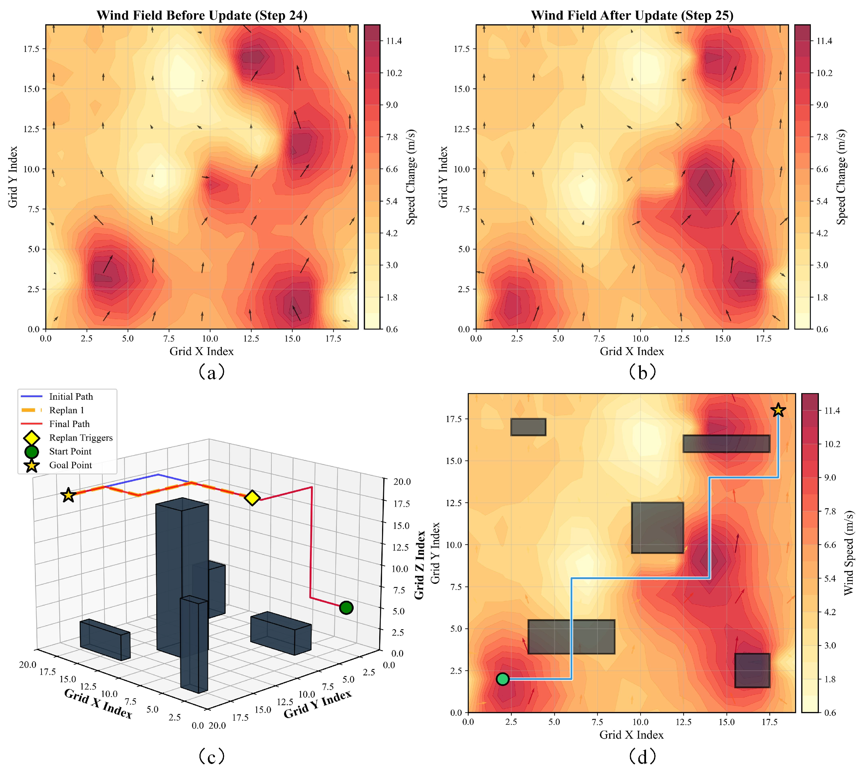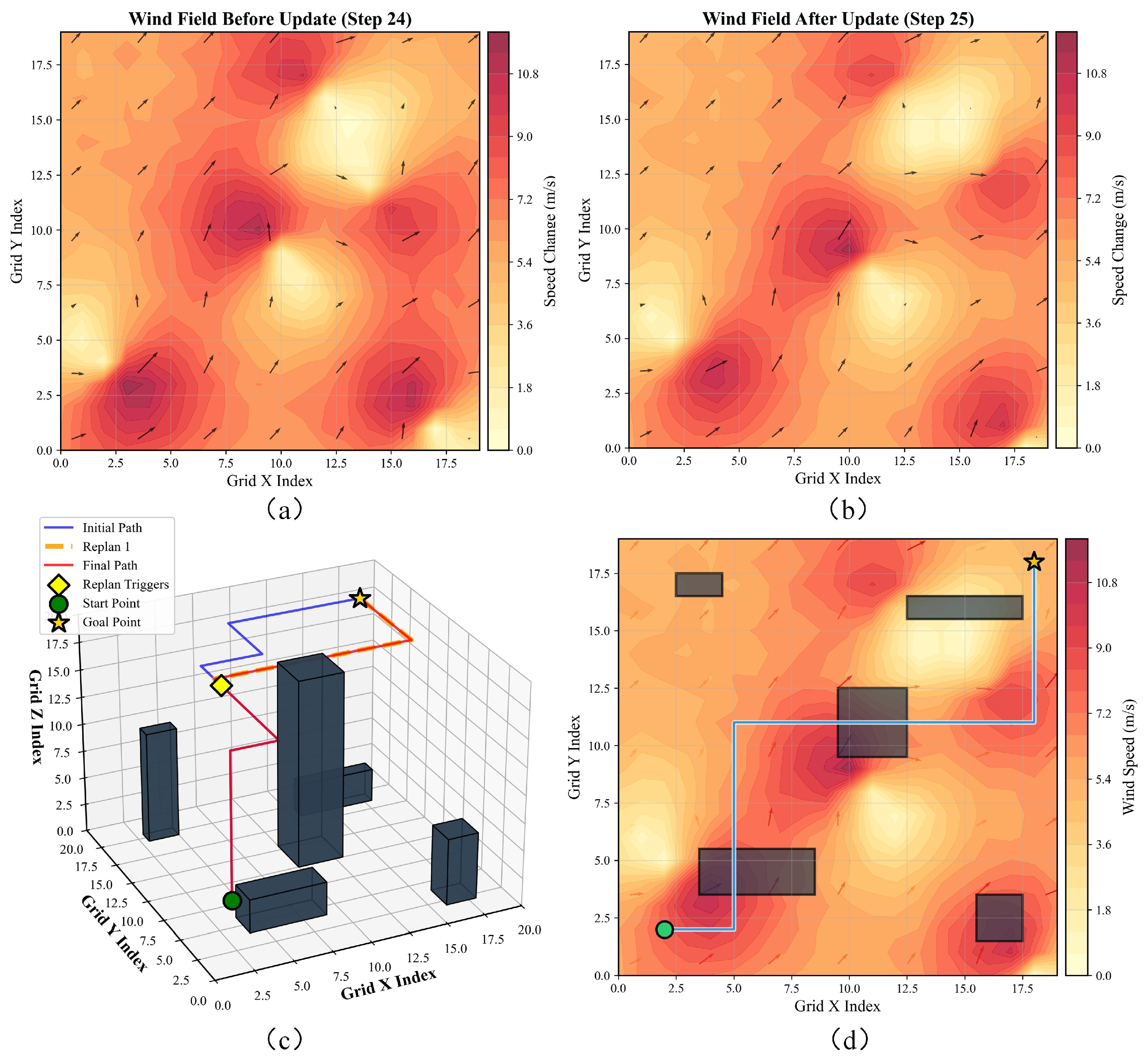 - Proposing a dynamic replanning decision algorithm based on wind-field change characteristics, which adaptively selects between global and local adjustment strategies to improve response efficiency.