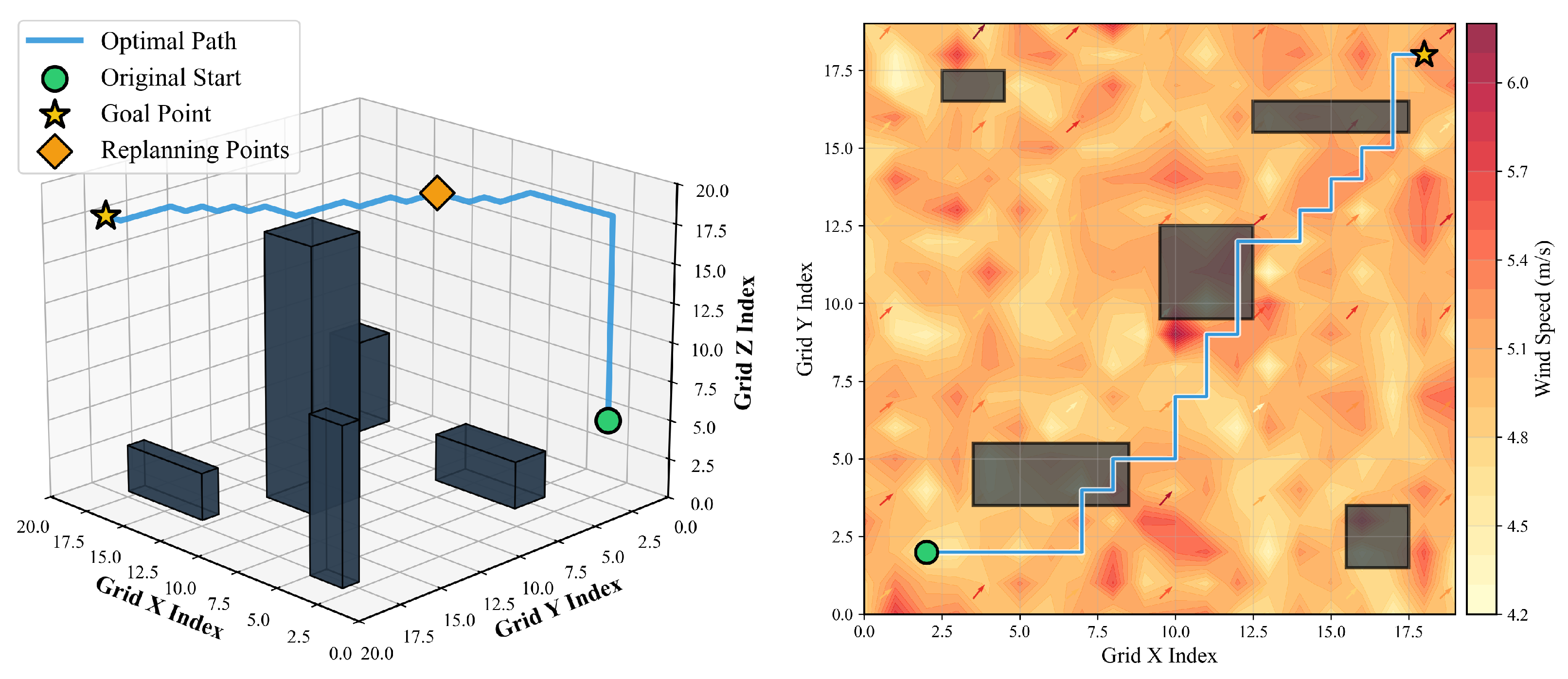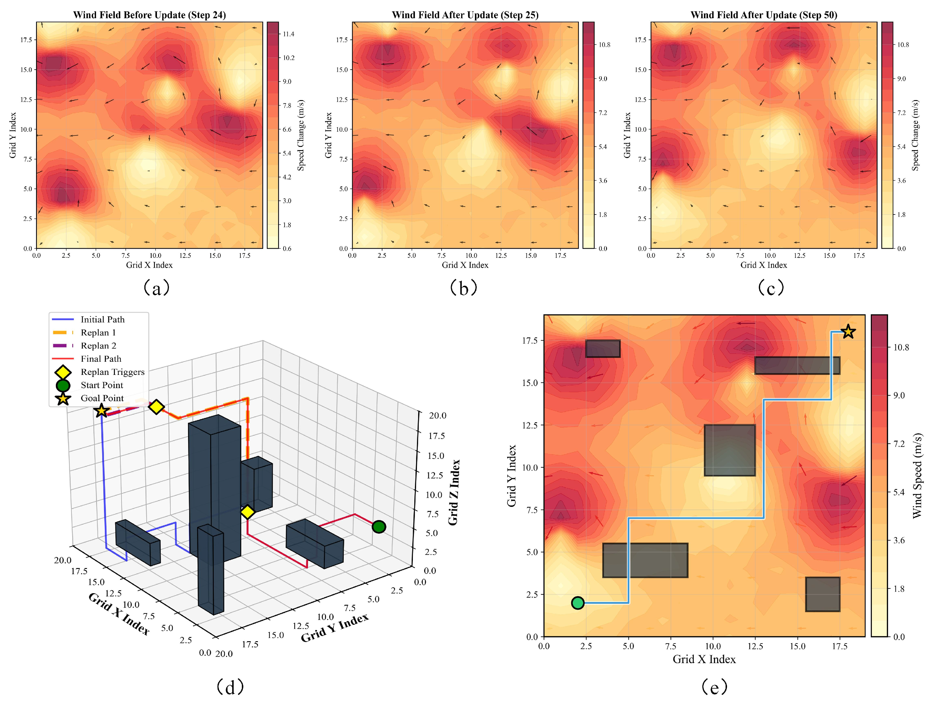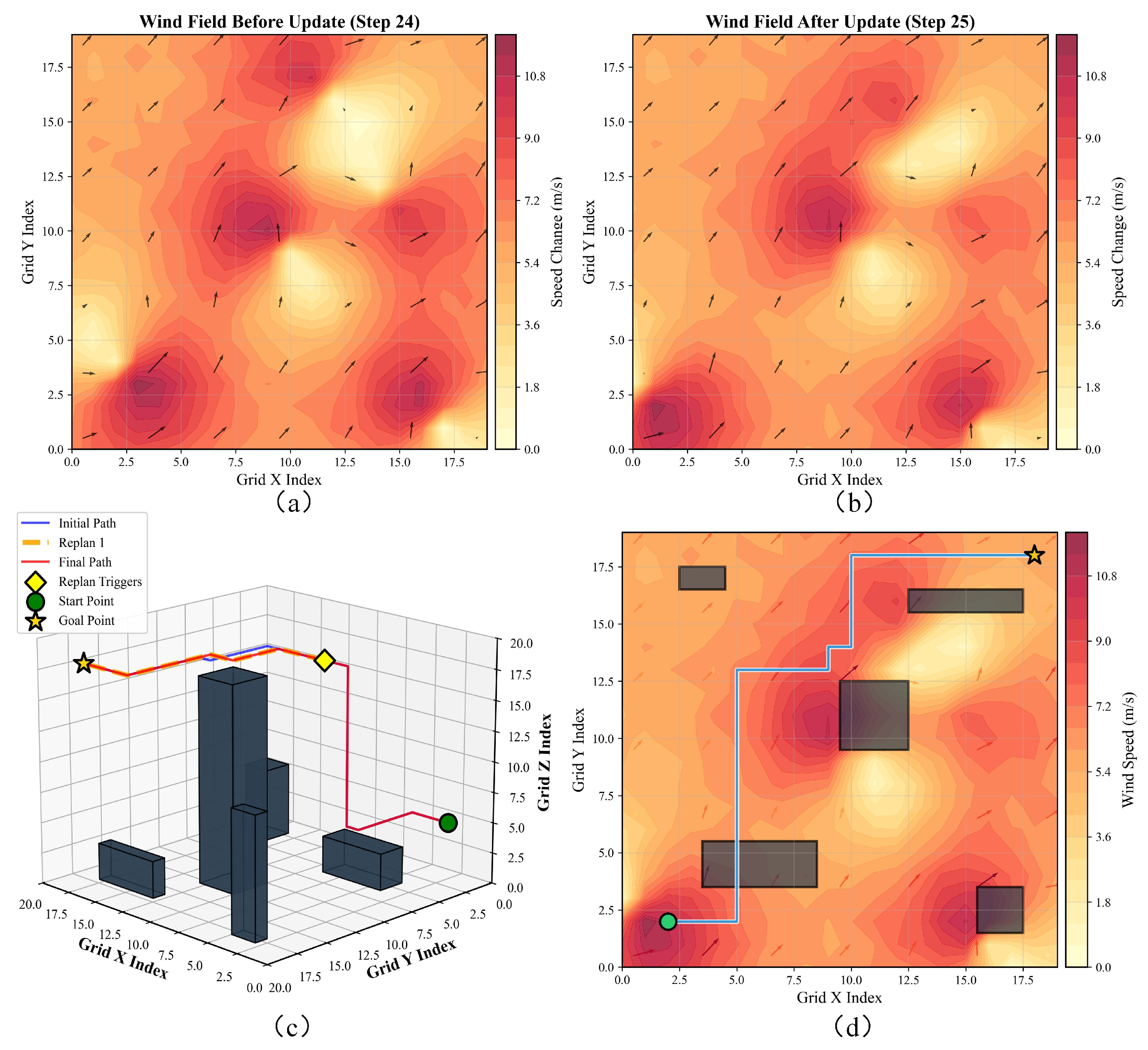 - Proposing a dynamic replanning decision algorithm based on wind-field change characteristics, which adaptively selects between global and local adjustment strategies to improve response efficiency.