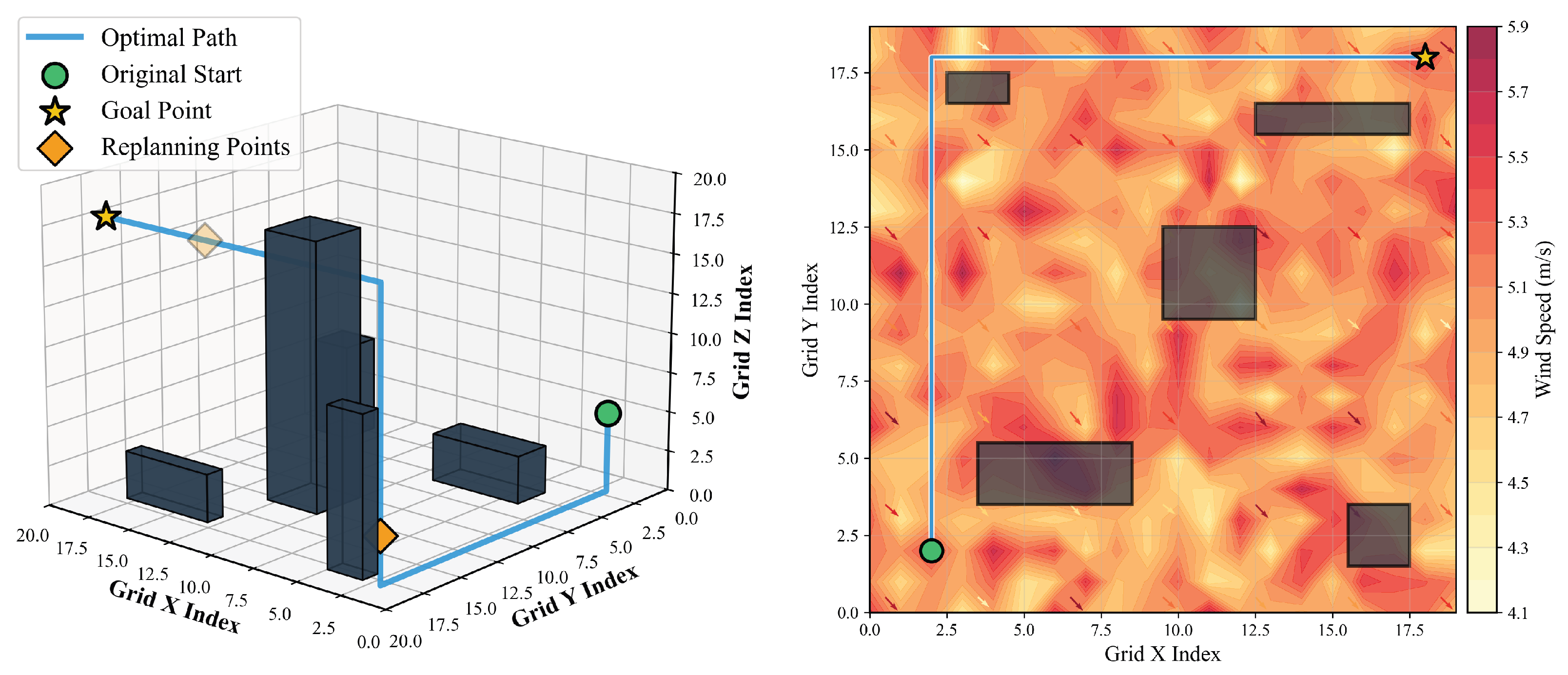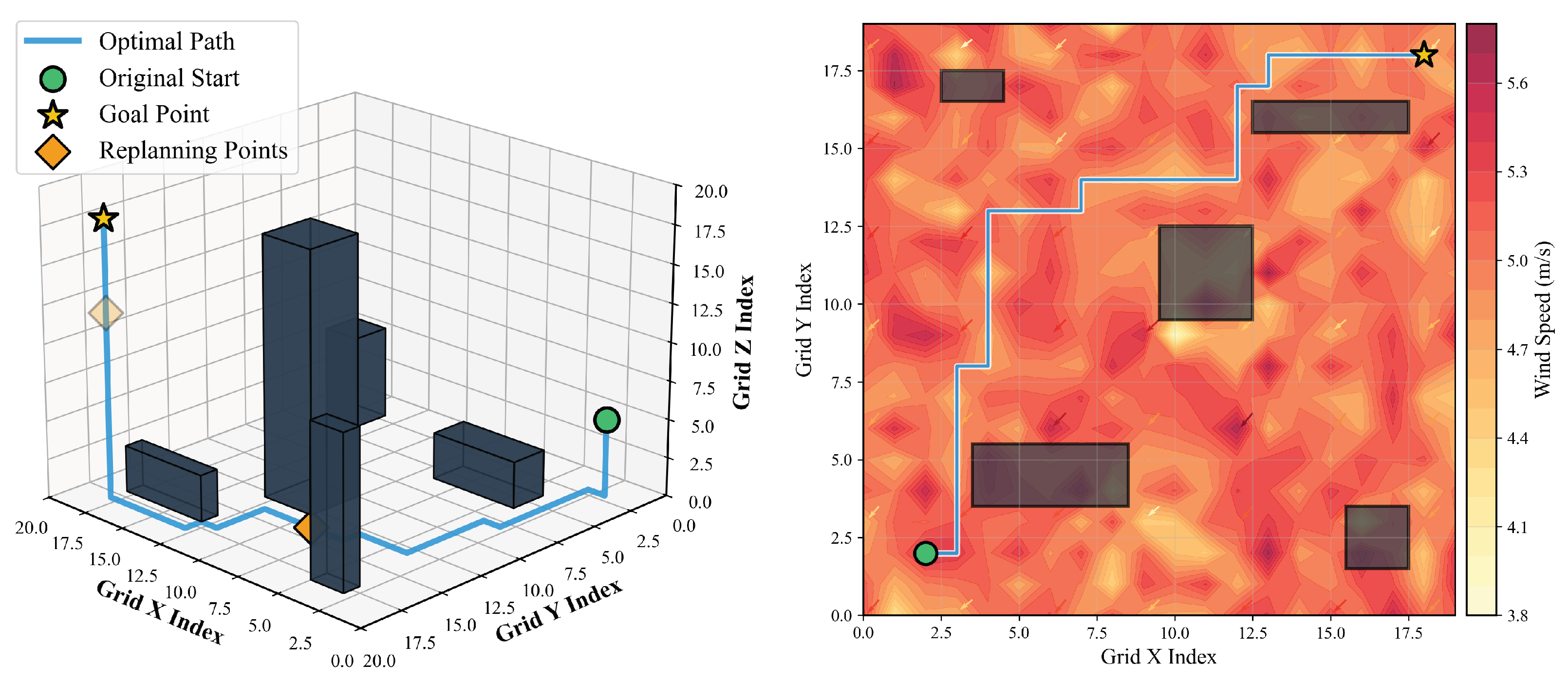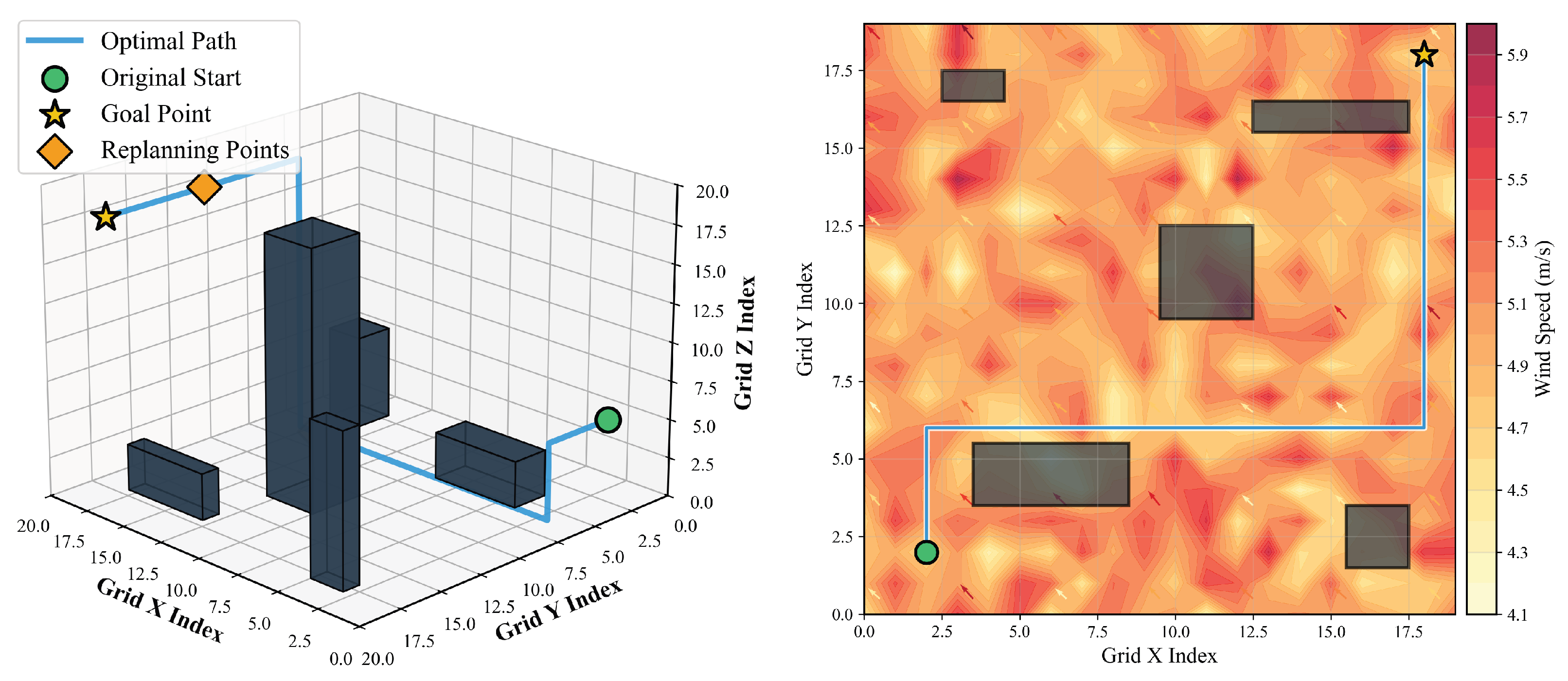 - Developed a wind-adaptive lifelong planning A* (WA-LPA*) algorithm that couples UAV energy modeling with dynamic wind-field perception to achieve energy-aware path optimization.
