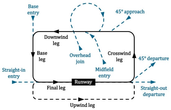 The altitude of the TP and the TP integration procedures can vary for different airspace environments, depending on the airport layout, the surrounding topography of the airport and the individual skills and preferences of the pilot [14,15]. As seen in Figure 1, there are several methods of entry into a standard TP. Before a VFR pilot enters a TP, the pilot must be able to assess the traffic in the TP and in the vicinity, as well as the wind conditions. Ideally, the pilot should fly at an altitude above that of the non-towered airports TP so that the pilot does not interfere with airspace users entering the TP. TPs are usually flown at an altitude of 1000 ft (∼300 m) AGL counterclockwise at a distance of at least 1.5 from the runway so that the left-seated pilot can keep the runway in view throughout the airport approach.