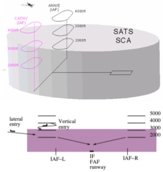 The operational concept of the SCA at SATS airports intended that aircraft approach fixed points arranged in the shape of a T, called Initial Approach Fixes (IAF) (see Figure 3). An IAF served as an entry point into the SCA on both sides of the T, IAF-L and IAF-R. If the aircraft was outside the SCA under ATC control, it had to wait at 4000 ft (∼1220 m) AGL. The holding areas within the SCA were located at 2000 ft (∼610 m) AGL and 3000 ft (∼910 m) AGL and served as an IAF. Based on the decisions of the AMM, aircraft entered the IAF either vertically or laterally. If the aircraft approached the IAF vertically, it remained at 3000 ft (∼910 m) AGL until it descended to 2000 ft (∼610 m) AGL. If the AMM decided on a lateral entry, the aircraft approached the IAF directly at 2000 ft (∼610 m) AGL. If the AMM gave the signal for a landing approach, the pilot continued to the Intermediate Fix (IF) and from there via the FAF to the runway. As a result, the SATS operational concept allowed for four simultaneous self-organized aircraft approaches under IMC at non-towered airports [20,21].