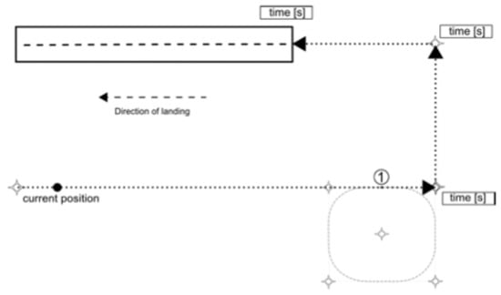 In Refs. [24,28], the UAS holding pattern is defined above the highest point of the TP to allow the RP of the UAS to decide when and how to enter the traffic circuit and, if necessary, to establish radio contact with other airspace users. The holding pattern consists of five WPs, which, depending on wind direction and traffic, can enable the RP to approve an omnidirectional landing. The four outer WPs represent the entry into the holding pattern and allow the UAS to enter the holding pattern (via the entry WPs) in a clockwise or counterclockwise direction; see Figure 4. The outer WPs also serve as exit WPs, from which the UAS descends into the beginning of the downwind leg at TP height.