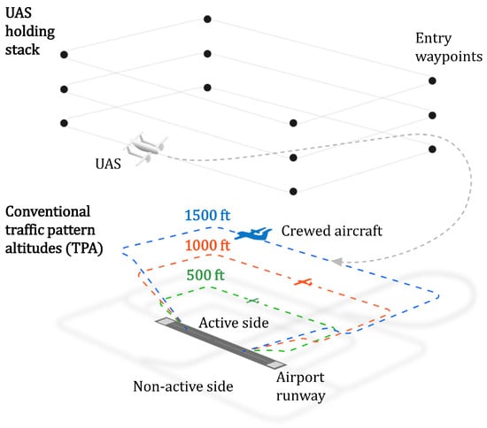 For a UAS to enter holding, similar to NASA’s SATS program, it is expected that the UAS will approach fixed points (i.e., entry waypoints) above the airport’s individual TP and wait at conflict-free altitudes until the UAS can descend into lower holding areas or approach the runway directly from initial holding. While in the SATS program, aircraft communicated via an AMM on the ground of the airport that assigned aircraft to holding altitudes and provided sequencing information, UAS are expected to communicate within a digital ecosystem, such as U-space, in the proposed concept and separate according to onboard DAA functions and/or conflict management services provided by data service providers, when such a system is active. In the absence of such a system, the RP will communicate with traffic via a VHF radio link, like a pilot of a crewed aircraft. The detailed interaction of UAS traffic management systems with UAS and crewed aircraft is beyond the scope of this paper but can be explored in more detail in Refs. [38,45].