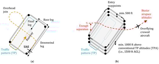 In 2022, the European SESAR Joint Undertaking research project INVIRCAT proposed a Concept of Operations (ConOps) for the integration of UAS into controlled terminal airspaces of towered airports under IFR [26]. Different technical and operational aspects for a seamless integration of UAS into controlled terminal airspaces were investigated, followed by simulations to validate the concept. The ConOps included aspects like system latency regarding Command and Control (C2) link and voice communication link, automatic takeoff and landing, handover of UAS control between different RPs and impact on ATC, and contingency procedures such as Lost C2 Link (LC2L) (i.e., the C2 link is severed) [27]. However, most of the research in this area has focused on integrating UAS at major towered airports under ATC supervision with the help of defined IFR approach procedures. It can be assumed that the integration of UAS at towered airports with published IFR procedures is likely to occur relatively seamlessly, with UAS following the already standardized procedures for crewed aviation. Today, Standard Terminal Arrival Routes (STAR) and Standard Instrument Departure Routes (SID) guide IFR aircraft to and from the en-route airspace via initial approach fix points to separate traffic based on checkpoints that restrict flight levels and speeds. The integration of UAS at airports becomes much more complex when there are few, if any, IFR procedures and VFR aircraft operate in the airspace around the airport. Due to the presence of these less predictable VFR aircraft, there is greater uncertainty in airspace environments of non-towered airports, with only “see and avoid” principles and schematic TPs (rather than instrument procedures) being common separation procedures for today’s airspace users.
