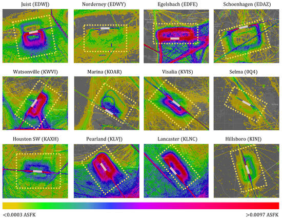 Airports with TPs on both sides of the runway are treated slightly differently. For example, Juist (EDWJ) is a non-towered airport located on one of the islands in the German North Sea. It has two recommended active TPs: north of the runway for motorized aircraft and south of the runway for non-motor-driven aircraft (e.g., gliders), which can be seen in its VOC in Figure 2. The traffic density heatmap of historical flight track data at Juist (EDWJ) shows that the southern TP has a higher traffic density than the northern TP over an exemplary altitude band of 0–3000 ft AGL (∼910 m) (see Figure 8). In the case of two active TPs, the length of the UAS holding stack legs is determined by the TP on the same side of the runway, which in turn is determined according to the highest historical traffic density, as explained earlier in this paper. In other words, the UAS holding stack is not simply double the size of the busier historically flown TP but is an overlap of both TPs.