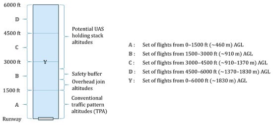 The traffic management of the UAS holding stack, such as UAS integrating into the holding stack or from the holding stack into the airport TP, especially in high-density traffic scenarios, and highly automated merging and spacing with other airspace users, could be managed by digital traffic services within an U-space ecosystem (see Section 2.3.2) or by supplemental data service providers outside of U-space, for example. The location of the holding stack should be sufficiently separated from other traffic, while nonetheless being close enough to the TP that integration is feasible given the inherent uncertainty and complexity of the non-towered environment. Additionally, the holding stack should be close to the airport of interest so that the UAS can divert to the holding stack in the event of a safety threshold, discussed in the previous section, being exceeded without adding excessive distance and time to the flight. To meet these requirements, the proposed location of the holding stack is placed above historically flown TPs of a non-towered airport, as depicted in Figure 6.