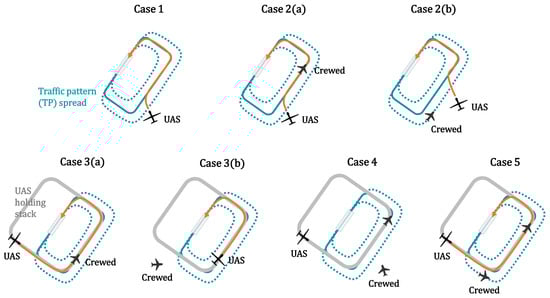 Recalling the assumption that, for certain low levels of traffic, the RP can successfully integrate the UAS into the TP (here called a “visual-like” approach), these assumptions lead to five theoretical scenarios for UAS integration in VMC; see Table 1. It is assumed that a UAS in an LC2L state is incapable of executing a “visual-like” approach. Although novel flight rules have been proposed in literature (see [38,39]), no novel flight rules are assumed in this work. These five theoretical scenarios indicate the need to measure the complexity of traffic in and around the airspace of the TP, as well as the need for some sort of holding maneuver. Consequently, this work proposes a holding maneuver to be applied in Scenario 3. A holding maneuver may also apply in Scenario 5, though a further distinction based on the phase of flight is an area of future research. Inherent in the five scenarios is the assumption that traffic in the pattern can be detected and complexity assessed, and that there exist certain safety thresholds at which the UAS moves from one scenario to the next.