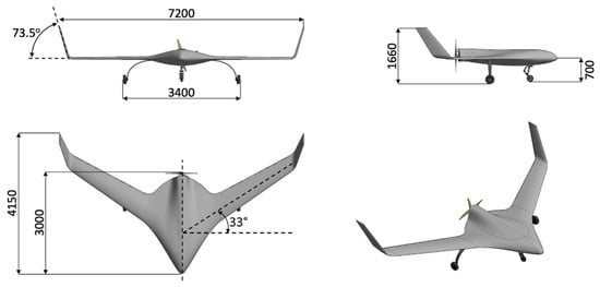 Figure 2. External layout of the tactical BWB UAV baseline platform in millimeters (mm).