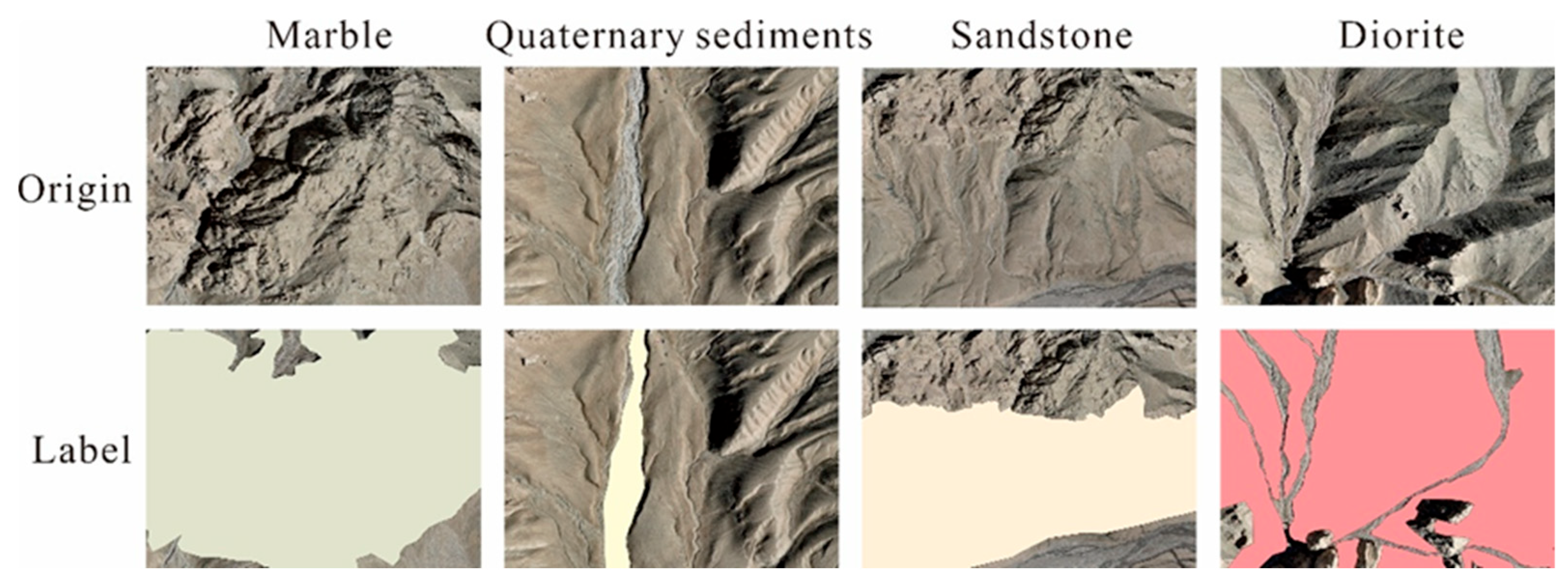 First, high-resolution RGB orthophotos of the Ququleke study area were obtained via UAV oblique photogrammetry. Raw images underwent geometric correction to remove distortions due to flight tilt and terrain relief, followed by color normalization to standardize brightness and contrast across different acquisition sessions. The imagery was then tiled into fixed-size 256 × 256-pixel patches, a format compatible with deep convolutional networks. Combined with precise manual annotation, a lithology semantic segmentation dataset was constructed.