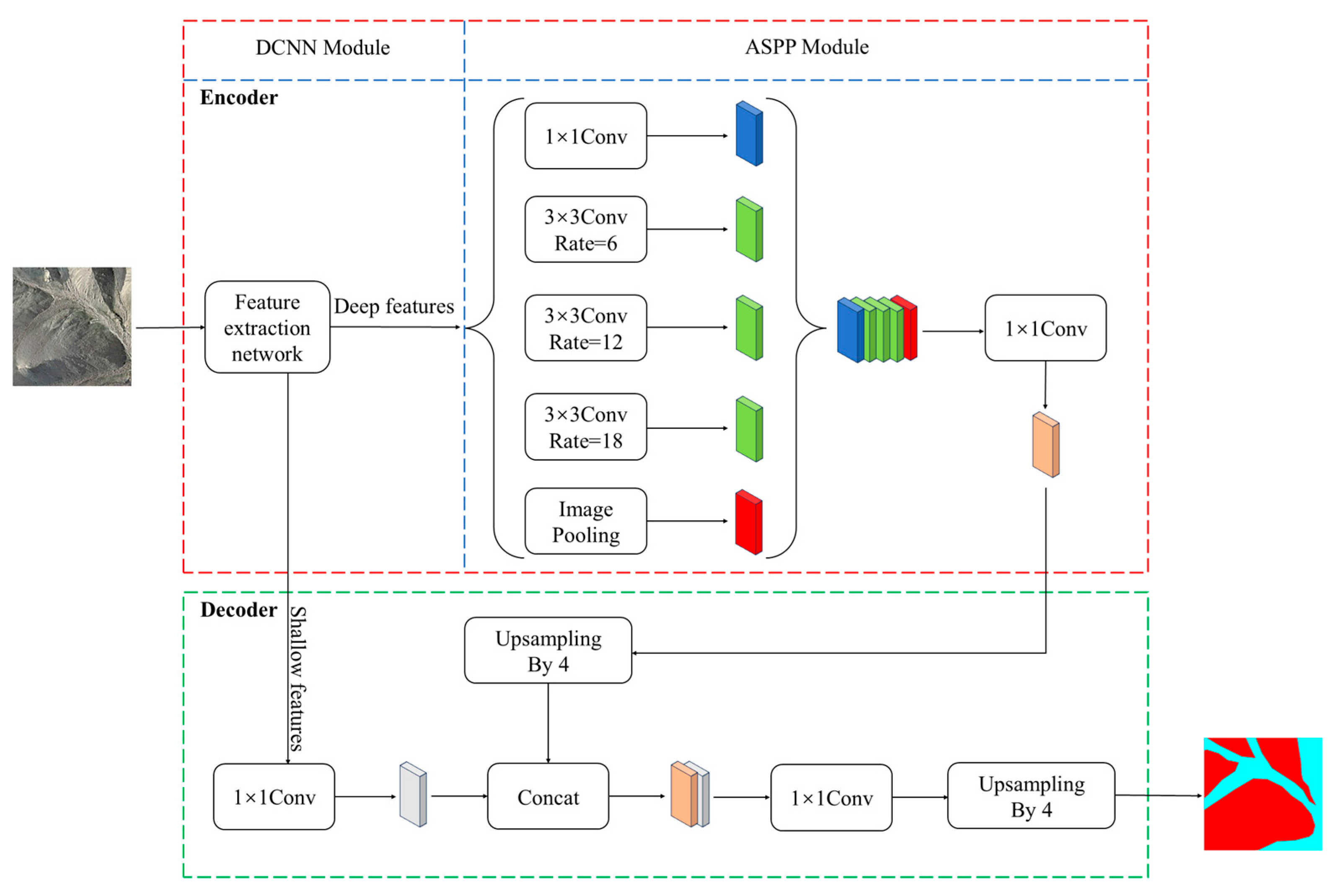 40] being one of its key tasks. Image segmentation aims to classify pixels within an image, thereby identifying and separating different targets and regions. For UAV-captured field outcrop imagery, factors such as vegetation cover, rock weathering, and blurred lithological boundaries can reduce the accuracy of traditional segmentation methods. Therefore, this study adopts the DeepLabV3+ network model as the baseline segmentation framework. Proposed by Google in 2018, DeepLabV3+ builds upon an improved encoder–decoder structure and a multi-scale feature fusion strategy, enabling substantial accuracy improvements under complex background conditions. It is particularly suitable for geological imagery tasks where details are abundant and inter-class differences are subtle.
