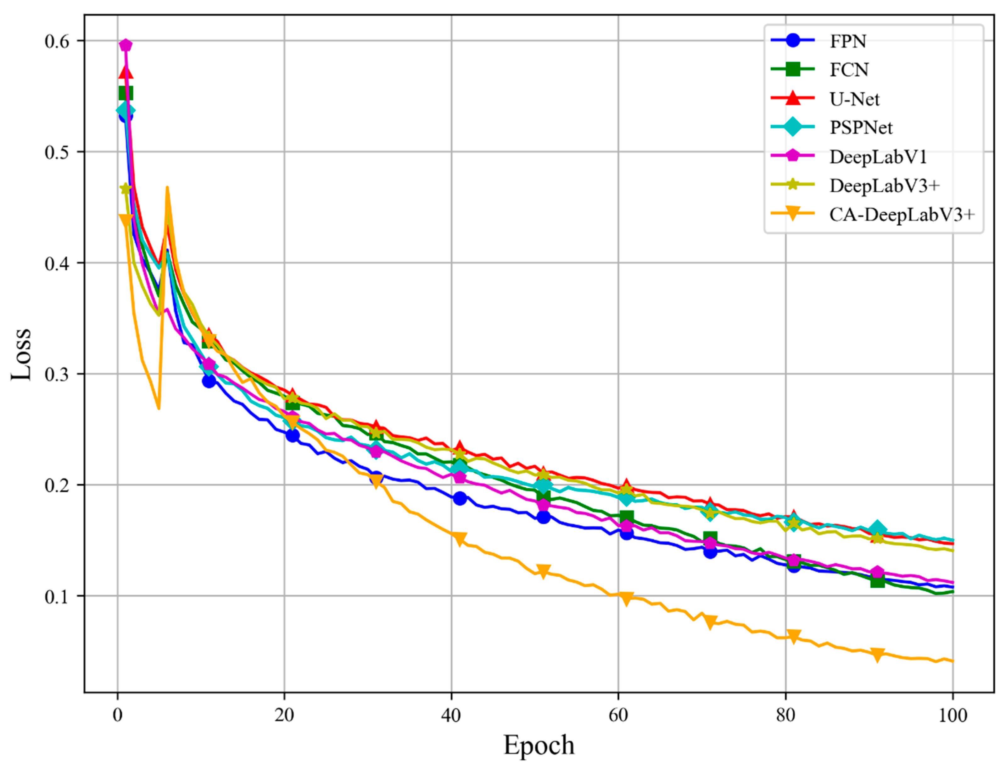 CA-DeepLabV3+ demonstrated the most pronounced early-stage improvement: the loss dropped sharply to approximately 0.28 within the first few iterations, markedly faster than in other networks. This suggests that the integration of Coordinate Attention enhances the model’s ability to focus on critical spatial-channel features at an early stage, accelerating convergence. By Epoch 40, the loss fell below 0.20 and steadily decreased to ~0.06—the lowest among all tested architectures. In comparison, DeepLabV1 and standard DeepLabV3+ converged around 0.12–0.13, while U-Net and PSPNet converged more slowly and at higher final losses (>0.16).
