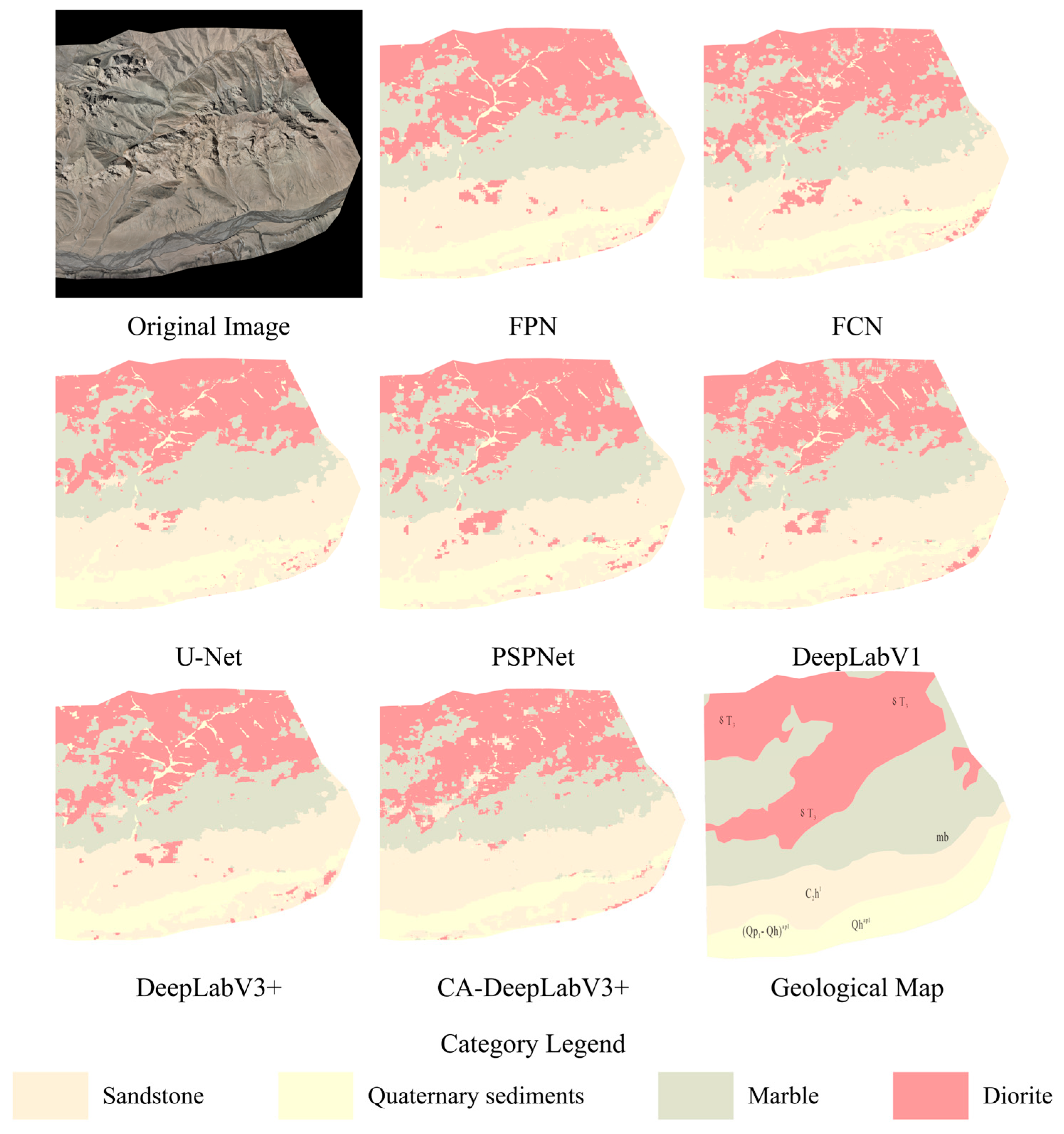 23], its integration with UAV oblique photogrammetry for lithological mapping represents a pioneering application in a geological context. In addition, a lightweight MobileNetV2 backbone was employed and transfer learning was applied to reduce computational complexity. Comparative experiments against FPN, FCN, U-Net, PSPNet, DeepLabV1, and the standard DeepLabV3+ [