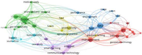 Figure 2 complements the topic categorization by showing a term co-occurrence network that highlights the main research themes linking GIS, drones, and agricultural logistics. The network shows 44 terms that had at least five co-occurrences across the corpus, forming six clusters. The green cluster centers on the term “drone” with occurrences in 54 articles and 26 links to central terms such as delivery, last-mile delivery, emission, cost, demand, and medical supply. These connections reflect operational and environmental aspects of drone-based logistics. The red cluster centers on the term “GIS” with occurrences in 33 articles and 24 links to terms including “geospatial technology,” “information,” “management,” “soil,” and “decision making.” This cluster highlights the role of spatial analysis and data-driven planning. The dark blue cluster focuses on the term “data” with occurrences in 44 articles and links to 38 terms such as “field,” “environment,” “land,” and “performance.” These indicate strong connections between geospatial datasets, environmental monitoring, and precision farming. The purple cluster centers on the term “internet” with occurrences in 24 articles and 25 links to terms including “smart farming,” “communication technology,” and “UAV.”