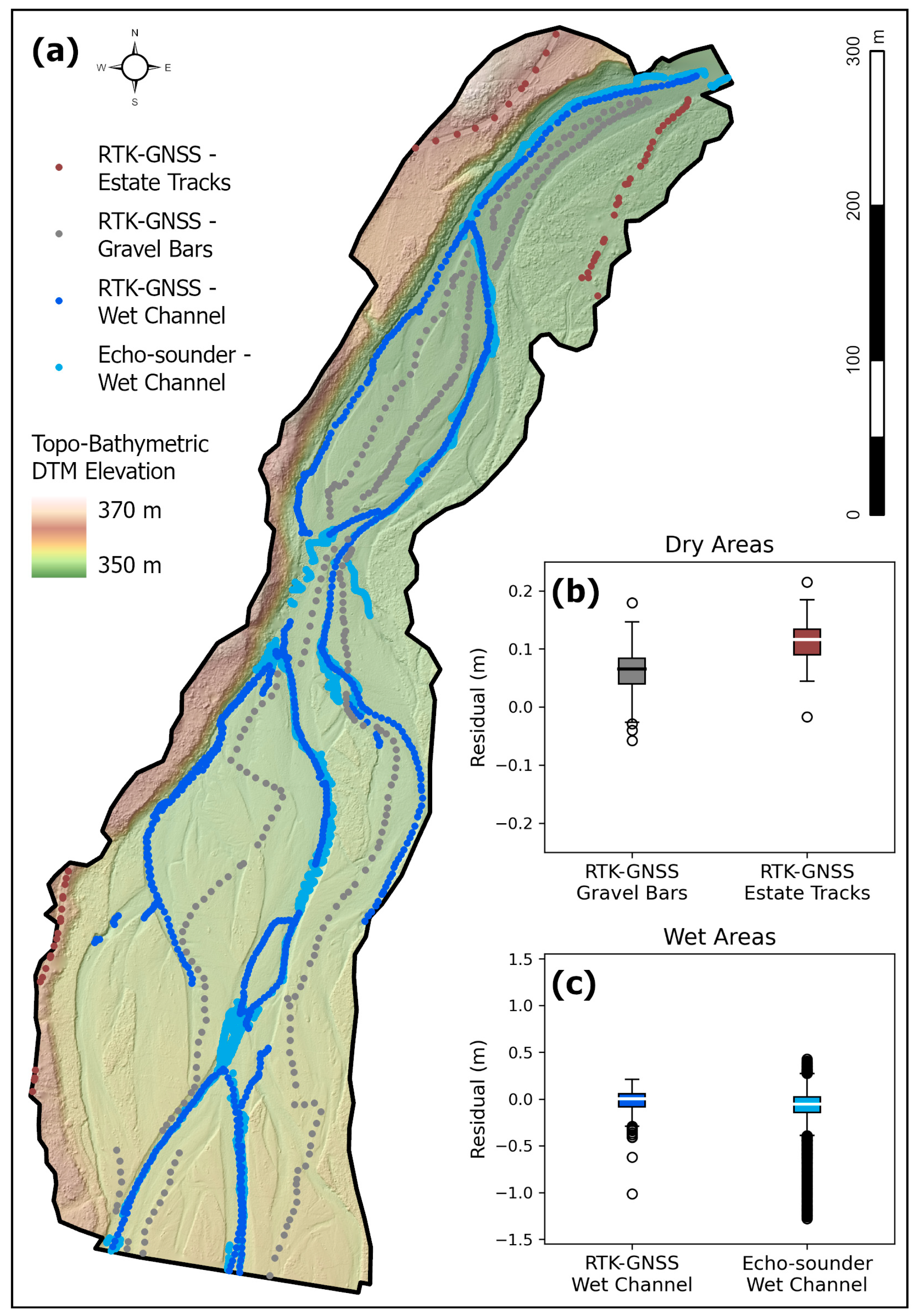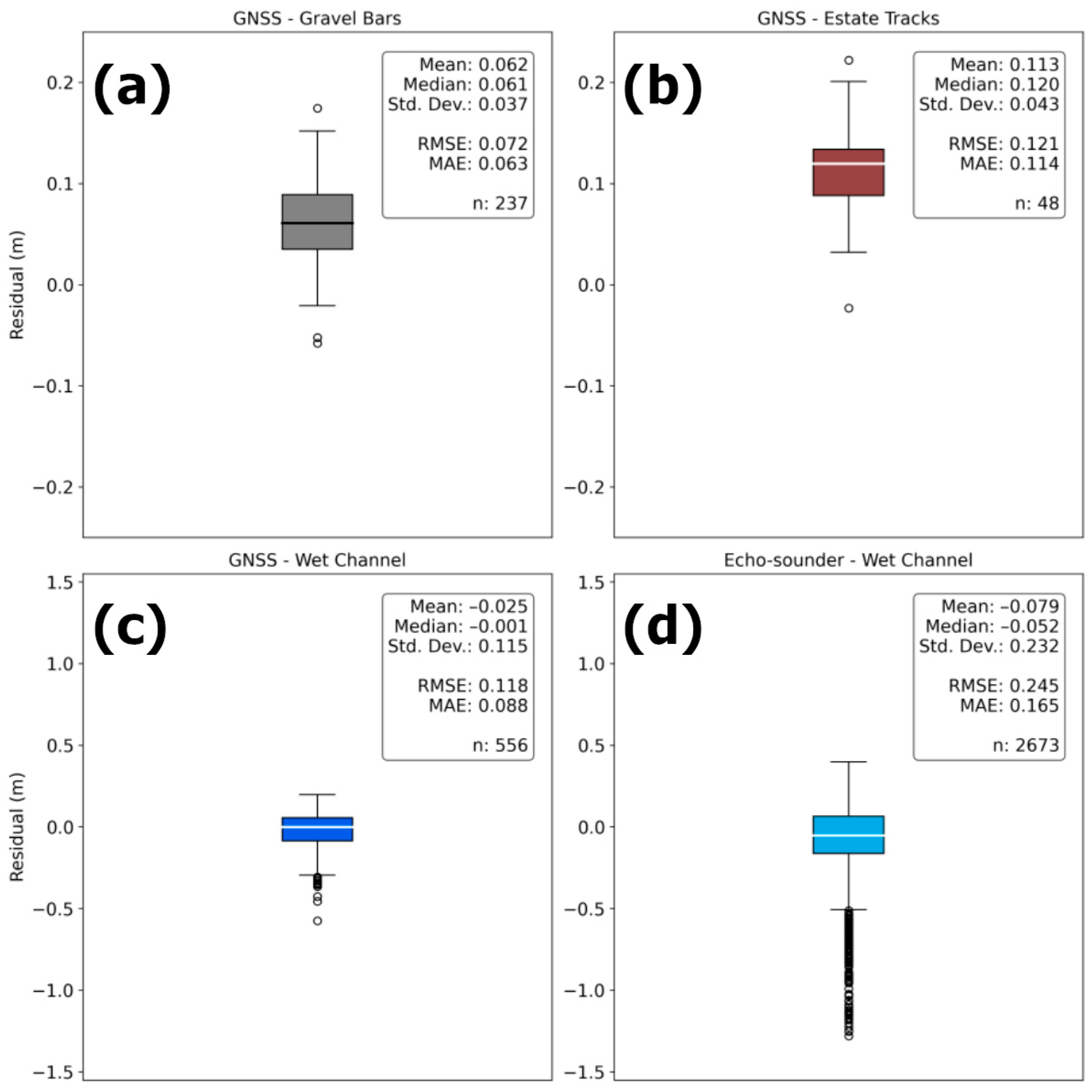 - Mean vertical errors, with associated standard deviations, were acceptable for dry gravel bars (0.06 ± 0.04 m, n = 237), shallow wet channels (−0.03 ± 0.12 m, n = 556) and deeper wet channels (−0.08 m ± 0.23 m, n = 2673).