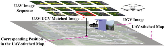 Unmanned ground vehicles (UGVs) play a critical role in disaster response, performing perception, navigation, and task execution in highly complex and dynamic environments. However, achieving reliable localization remains a persistent challenge, as Global Navigation Satellite System (GNSS) signals are frequently degraded or completely denied due to building occlusion, electromagnetic interference, or infrastructure damage [1]. In such environments, unmanned aerial vehicles (UAVs), with their overhead perspective, wide-area coverage, and rapid deployment, can complement UGVs by providing global situational awareness. Specifically, by stitching UAV-captured images of disaster regions, a comprehensive representation of the target area can be constructed. Integrating this aerial perspective with the ground-level observations of UGVs enables aerial–ground collaborative localization, thereby facilitating reliable task execution in complex environments, as shown in Figure 1. This paradigm has garnered significant attention and emerged as a promising strategy for ensuring autonomy in GNSS-denied scenarios [2,3].