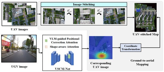 To bridge this gap, we proposed a Cross-View Matching and Localization (CVML) framework tailored for UGV matching and localization in UAV-stitched maps. The framework consists of a VLM-Guided and Spatially Consistent Cross-View Matching Network (VSCM-Net) to identify the matching similarities among UGV and UAV images. VSCM-Net integrates a VLM-guided attention mechanism with Transformer-driven global alignment, reinforced by explicit spatial consistency constraints. By embedding high-level semantic cues into spatial tokens, VSCM-Net enables robust matching among UGV and UAV images. Building on the above, we further extract the precise coordinates of the UGV’s position within the UAV imagery at the moment the UGV imagery is captured. By leveraging the transformation relationships established during the UAV stitching process, the positional correspondence of UGVs can be projected into the global UAV-stitched map, thereby constructing the continuous trajectory of the UGV. The contributions of this work are given as follows: