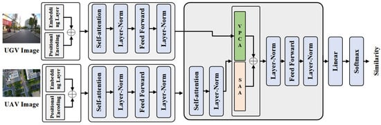 The proposed VSCM-Net adopts a Transformer-based architecture composed of an encoder-decoder structure, as illustrated in Figure 3. Compared with the conventional Transformer, this work introduces two attention modules in the decoder to explicitly model relationships between UAV and UGV images, the VLM-guided Positional Correction Attention (VPCA) module and the Shape-Aware Attention (SAA) module. These two attention modules are applied where encoder outputs enter the decoder, and the resulting features are aggregated and processed through normalization and feed-forward networks to compute UAV and UGV similarity.