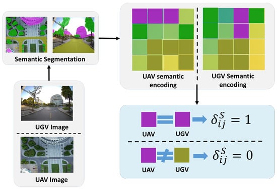 where is the attention amplification coefficient for structural regions, which can be set as a hyperparameter or learned during training. is the shape-aware bias matrix, and means the binary indicator that measures whether the token in position belongs to the same semantic type. Specifically, as illustrated in Figure 5, both the UGV and UAV images are processed by the semantic segmentation network to generate semantic masks, and is calculated as: