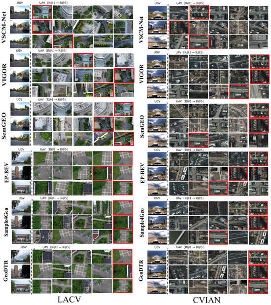On the LACV dataset, our method achieves the best performance across all three key metrics. In particular, the Top-1 recall reaches , markedly higher than GeoDTR , VIGOR , SemGEO (), Sample4Geo () and EP-BEV(), highlighting the model’s strong capability in producing highly accurate top-rank matches and ensuring robust localization reliability. The Top-5 recall attains , exceeding SemGEO by 12.61 percentage points and VIGOR by 34.77 percentage points, which indicates stable retrieval of the correct region within a compact candidate set. Furthermore, the AP of the proposed VSCM-Net reaches , substantially outperforming GeoDTR , VIGOR (), SemGEO (), Sample4Geo () and EP-BEV(), respectively, demonstrating that our approach yields more consistent and well-structured ranking distributions, thereby facilitating multi-candidate fusion and confidence-based decision-making.