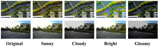 Seasonal changes in outdoor environments typically introduce significant variations in illumination, atmospheric conditions, and appearance characteristics. To systematically evaluate the robustness of the proposed framework under different seasonal conditions, we simulate diverse appearance variations on the LACV dataset through controlled photometric augmentation. Although the LACV dataset does not contain multi-season real-world captures, season-like variations can be approximated using image-level transformations that alter contrast and global brightness. As shown in Figure 7, four representative scene conditions are generated, including sunny, cloudy, bright, and gloomy, corresponding, respectively, to high-saturation summer scenes, low-contrast overcast conditions, high-luminance morning scenes, and low-light winter-like environments. The augmented datasets are than used for evaluation of the proposed method.